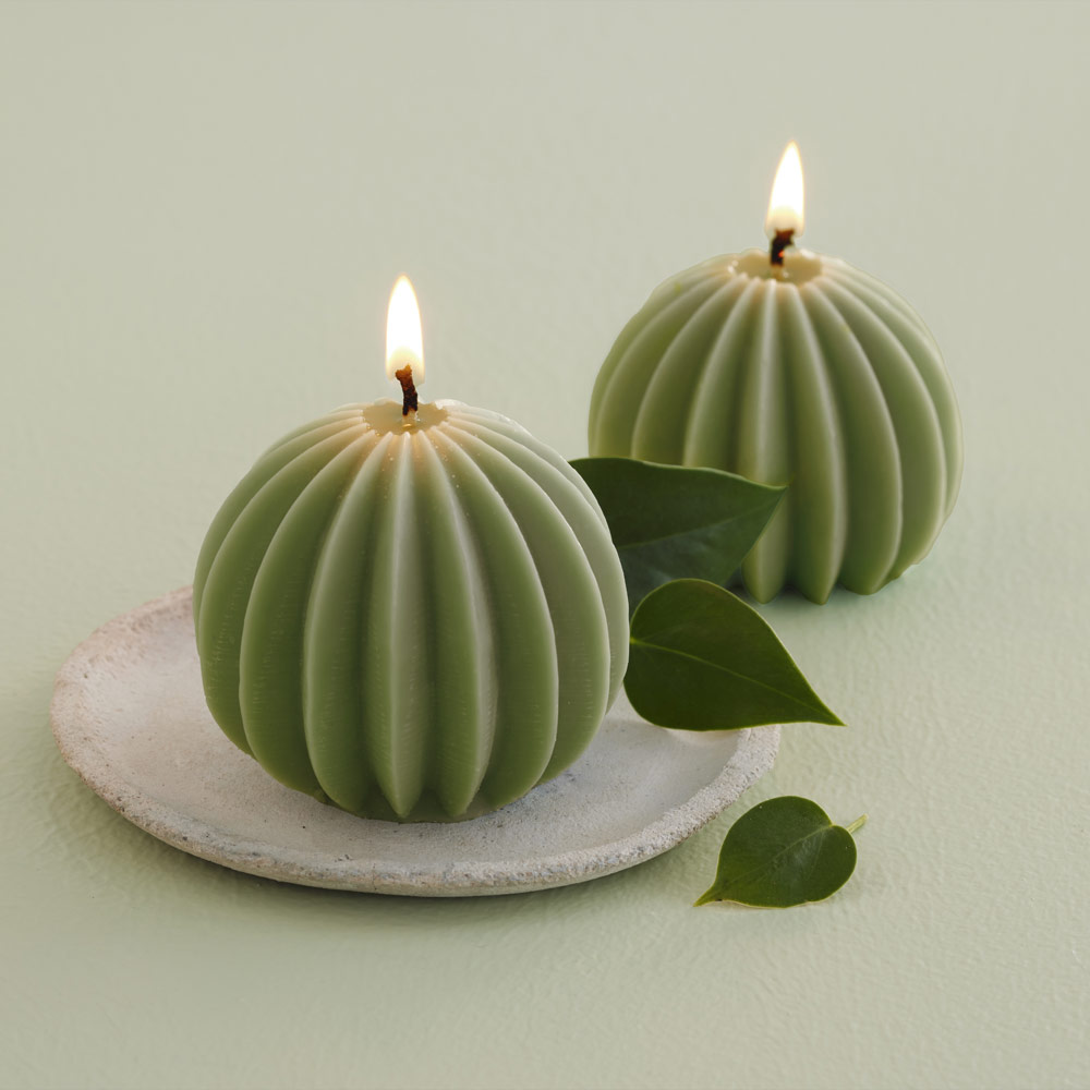 Dekorativt lys formet som kule med riller. Et naturprodukt laget av rapsvoks.